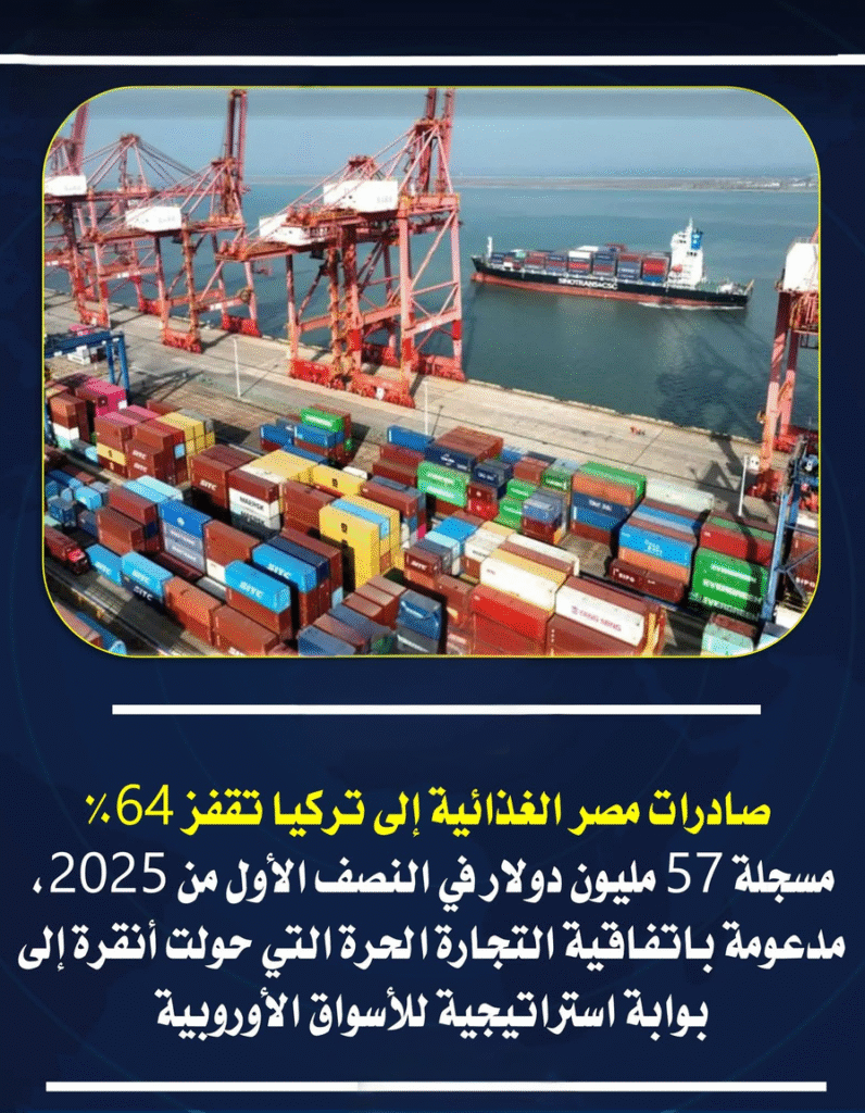 في خطوة جديدة تعكس قوة القطاع الزراعي والغذائي المصري، ارتفعت صادرات مصر الغذائية إلى تركيا بنسبة 64% خلال النصف الأول من عام 2025، حيث بلغ إجماليها 57 مليون دولار. ويأتي ذلك تزامنًا مع مشاركة 22 شركة مصرية بارزة في معرض إسطنبول الدولي للأغذية، الذي انطلقت فعالياته في 2 سبتمبر 2025، وسط تكثيف فرص تسويق متبادلة.